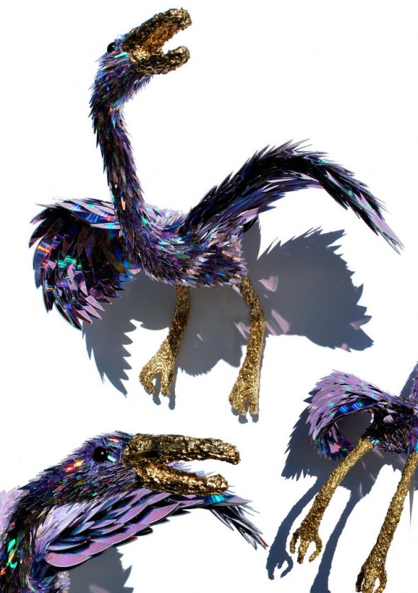 Seu foco são os pedaços de CDs quebrados e utilizando uma técnica de camadas ele os transforma em belos animais, alguns bem coloridos e outros com tons de dourado mas que parecem ter penas o pêlos de verdade.